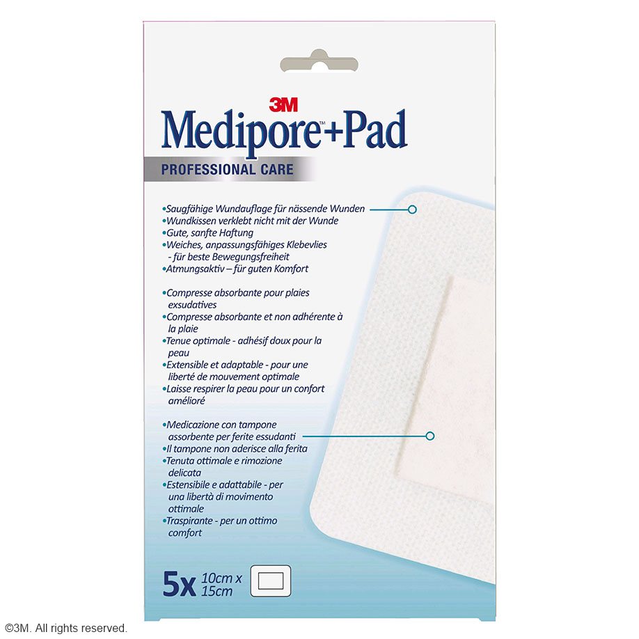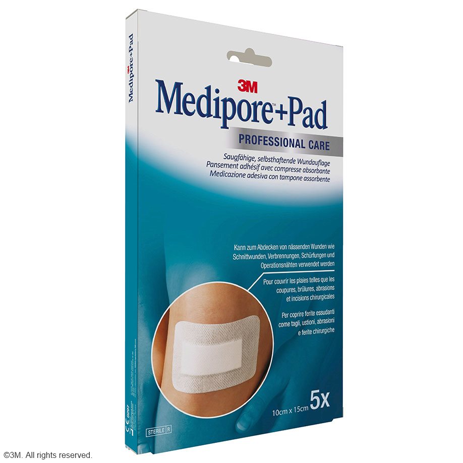 Medipore™ + Pad ist ein steriler Fertigverband mit einer nicht anhaftenden, absorbierenden Wundauflage. Überall da, wo es schnell gehen soll bietet er eine sichere und leichte Applikation in der Wundversorgung. Er ist weich, anschmiegsam und atmungsaktiv. Die Wundauflage absorbiert Sekret ohne an der Wunde anzuhaften. Medipore™ + Pad hat abgerundete Ecken und verhindert so ein vorzeitiges Ablösen des Verbandes. Er besteht aus einem Sontara-Polyestervlies, der Klebstoff ist ein hautfreundliches Polyacrylat.