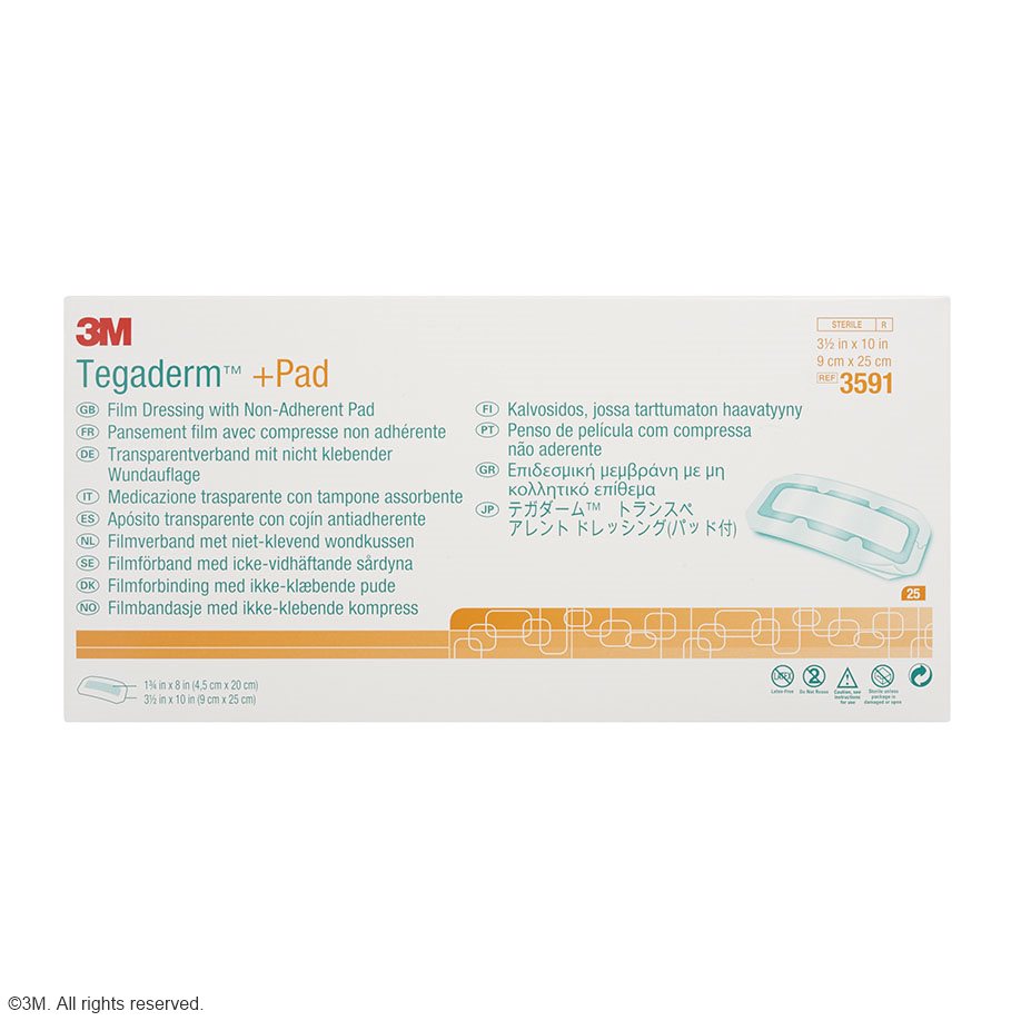 Tegaderm™ + Pad Transparentverband mit absorptionsfähiger Wundauflage ist ein vielseitig verwendbarer, steriler Fertigverband mit den Vorteilen eines Transparentverbandes: wasserdicht, keimdicht, abwischbar (auch mit alkoholischen Desinfektionsmitteln) und doch atmungsaktiv.