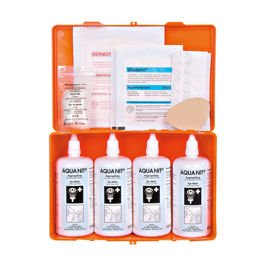 Kann an allen unfallgefährdeten Stellen und Arbeitsplätzen bereitgehalten werden. Hat durch die Wandhalterung immer einen festen Platz, kann mit einem Griff schnell und mühelos aus der Halterung entnommen und an den Unfallort gebracht werden. Es ist im Notfall immer reichlich Augenspülflüssigkeit vor Ort verfügbar, nicht benötigte Augenspülflaschen bleiben unversehrt. Inhalt: 4 gebrauchsfertige Druckspülflaschen, Sofortset für Augenverletzungen mit DuOcul-Augenkompressen, Augenklappe, SÖHNGEN® Silk Pflasterstreifen, DERMOTEKT® Kompresse und Einmal-Schutzhandschuhen. Kunststoffbox ca. 260 x 160 x 80 mm, orange, inkl.Wandhalterung.