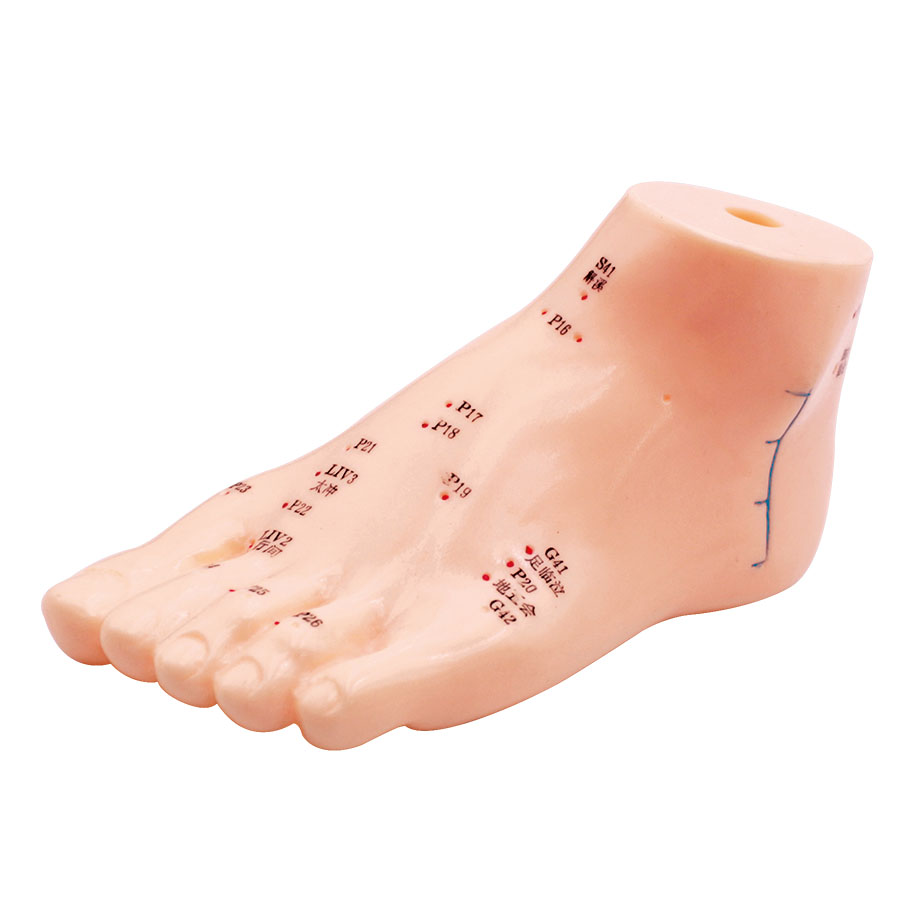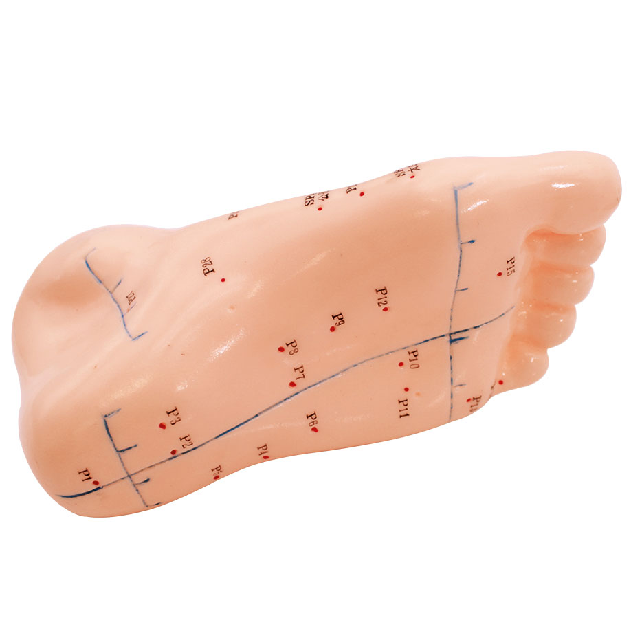 Akupunkturmodell des menschlichen Fußes aus Kunststoff mit einer weichen, hautähnlichen Oberfläche; die einzelnen Akupunkturpunkte und Meridiane sind mehrfarbig angelegt, das Modell ist ideal zum Üben und Veranschaulichen der einzelnen Therapieformen; ganz nebenbei werden neue Patienten durch dieses Modell darauf aufmerksam gemacht, dass Akupunktur als Therapieform in der Arztpraxis angeboten wird.