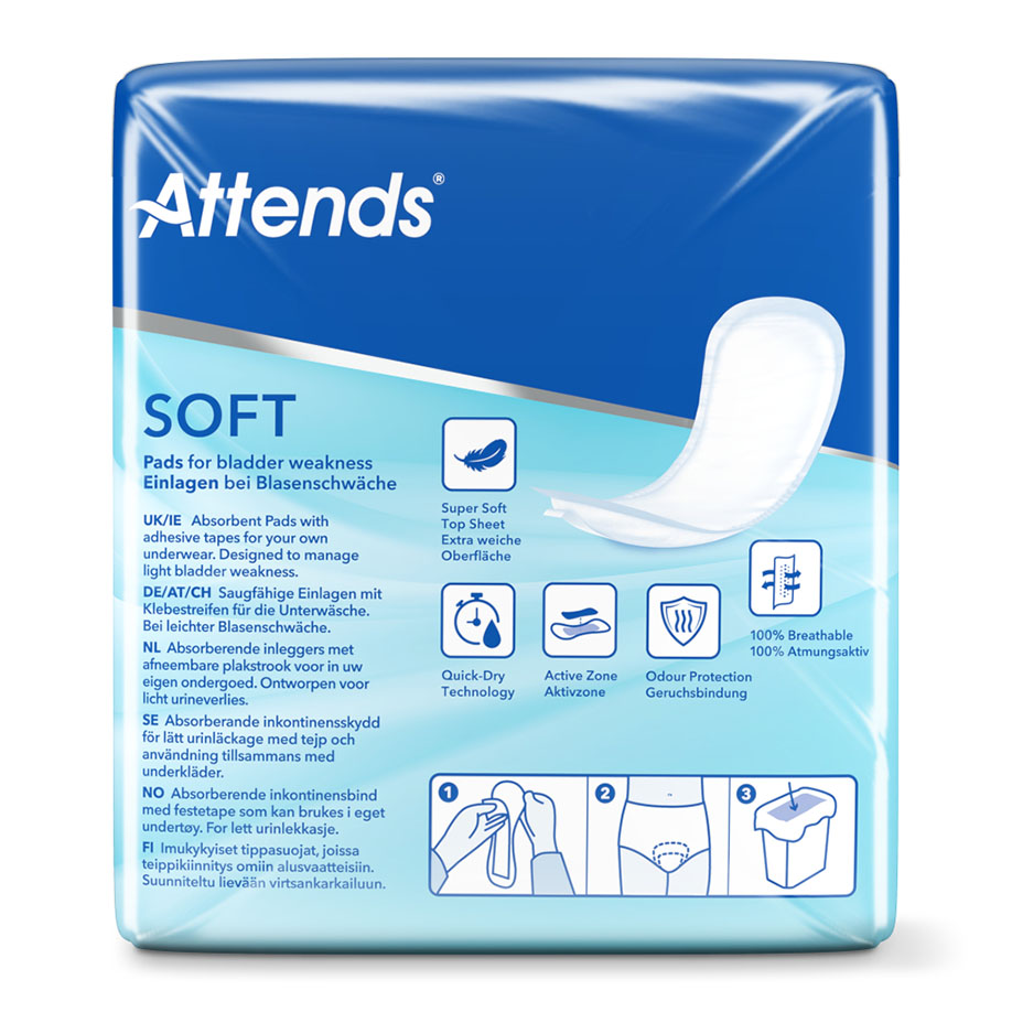 Attends® Soft sind saugfähige und diskrete Einlagen - speziell für empfindliche Haut. Dünne Einlage bei leichter Blasenschwäche.