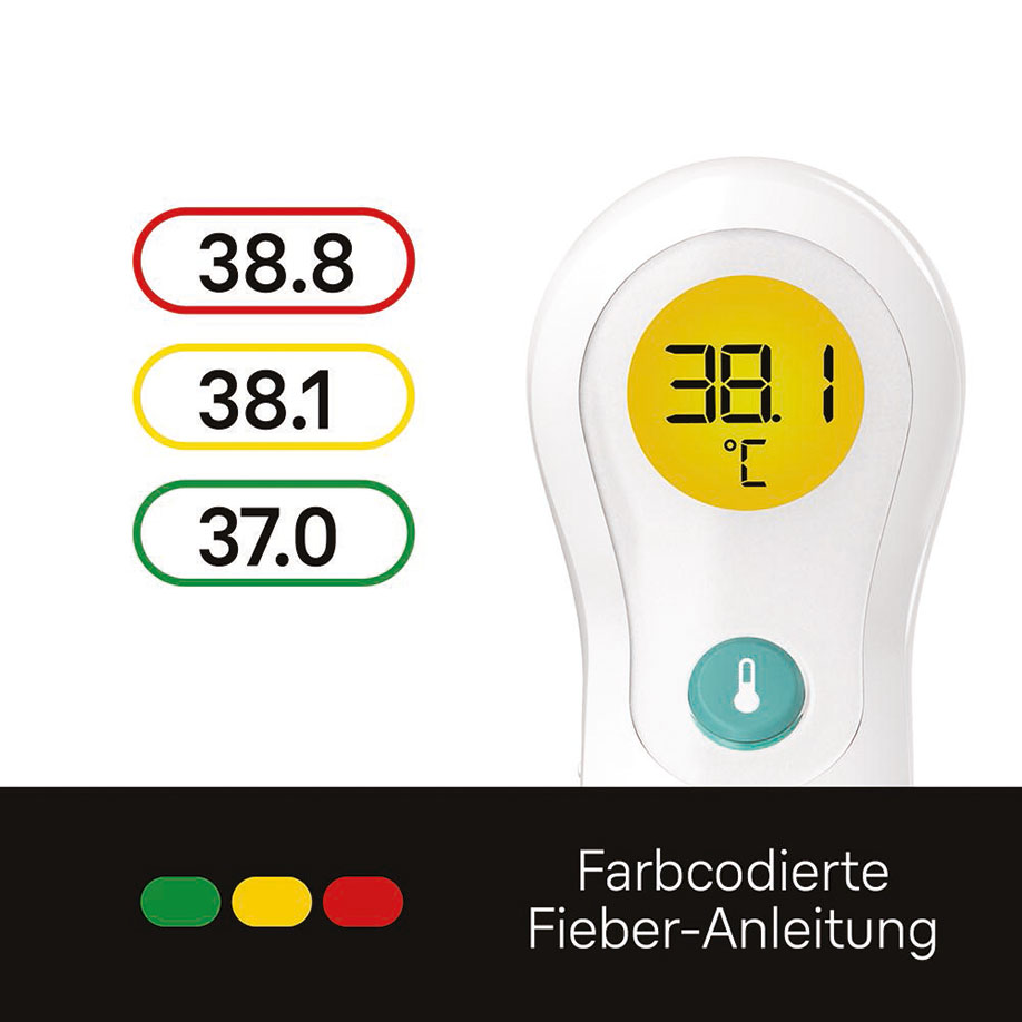 - farbcodierte Fieberanzeige zur Interpretation des Messergebnisses: grün für normale Temperatur, gelb für erhöhte Temperatur und rot als Fieberalarm