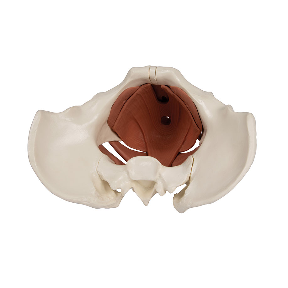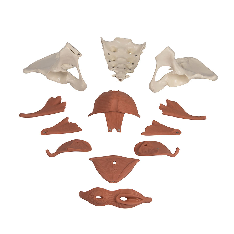 Zusammen mit den beiden Beckenhälften und dem Kreuzbein besteht das Modell aus insgesamt 12 Teilen. Das Modell wird von Magneten zusammengehalten, so dass einzelne Teile leicht zur Demonstration der einzelnen Schichten abgenommen werden können. Dieses Modell eignet sich hervorragend für Kurse in Beckenbodengymnastik, zur Geburtsvorbereitung, für die Hebammenausbildung oder einfach zum Studium der Beckenbodenmuskulatur.