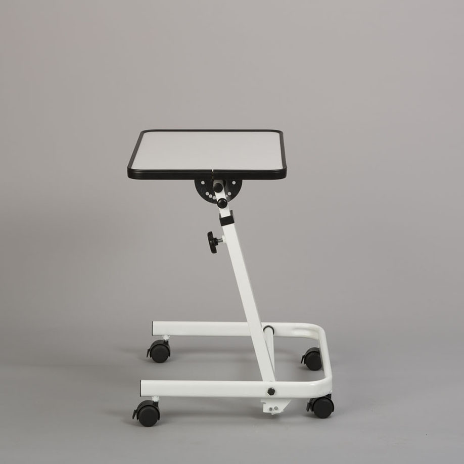 Beim Schreiben, Lesen, Essen und vielem mehr wird dieser praktische Helfer gefallen. Die Tischplatte kann in vorgegebenen Lochungen festgestellt werden, für höhere Stabiliät und Sicherheit. Die Tischplatte selbst ist klappbar, mit erhöhter Umrandung und kann dadurch Gegenständen sicheren Halt geben. Der Tisch hat eine neigbare Säule um 80° und kann den räumlichen Verhältnissen angepasst werden. Das Fußgestell lässt sich unter das Bett schieben, sodass die ganze Tischplatte vor dem Patienten ist. Vier Leichtlauf-Rollen, alle feststellbar mit Bremse. Bei Nichtgebrauch platzsparend zusammenklappbar.