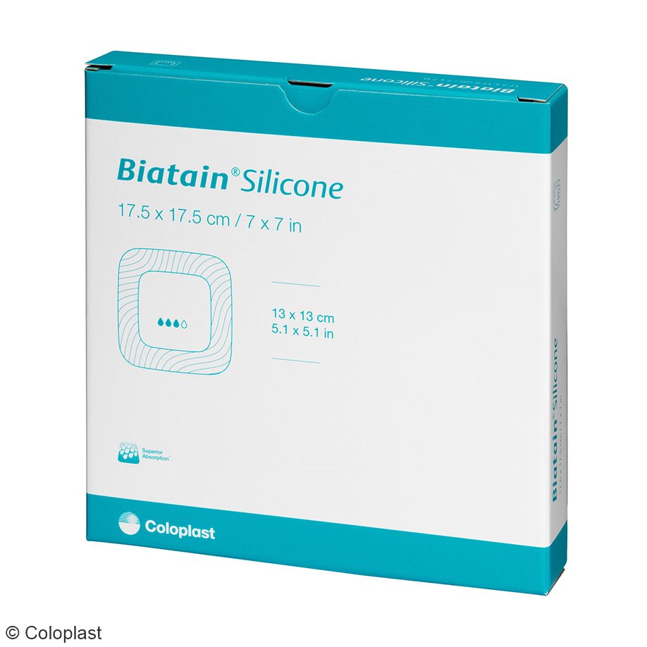Biatain® Silicone ist ein Polyurethanschaumverband mit einer sanften, vollflächigen Silikonhaftung. Durch einen vollen Kontakt des Schaumkissens mit der Wunde zeichnet sich der Verband durch eine ungehinderte, sehr gute Absorption aus. Die exzellente Retention ermöglicht den Einsatz des Verbandes unter Druck (Kompression). Durch das Silikon Distanzgitter lässt sich der Verband atraumatisch und schmerzarm Entfernen und Repositionieren. Eine einfache, aseptische Applikation wird dank der Non-Touch-Technologie ermöglicht, einer 3-teiligen Applikationsfolie. Durch den extrem flexiblen Aufbau, ist der Verband sehr anschmiegsam und passt sich gut der Körperkontur an.