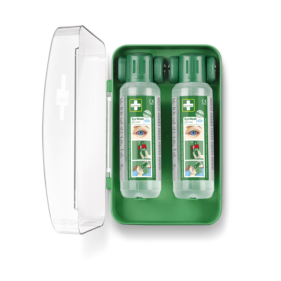 Kompakter Augenduschen-Wandhalter, der vor Staub und Wasser schützt. 2 Flaschen Cederroth Augendusche inklusive. Passt auch in kleinere Räume. Transparente Abdeckung für gute Sichtbarkeit. Beim Herausdrehen aus der Halterung öffnen sich die Flaschen automatisch. So kann sofort mit der Spülung begonnen werden. Der Kunststoff in grüner Farbe besteht aus > 64 % recyceltem Kunststoff. Perfekt für staubige, schmutzige Umgebungen sowie Arbeitsplätze mit hoher Gefährdung, die viele Flaschen benötigen, oder bei beengten Platzverhältnissen. Cederroth Augendusche ist zum Ausspülen von ätzenden Alkali- und Säurespritzern sowie Fremdkörpern (Schmutz und Staub) vorgesehen.