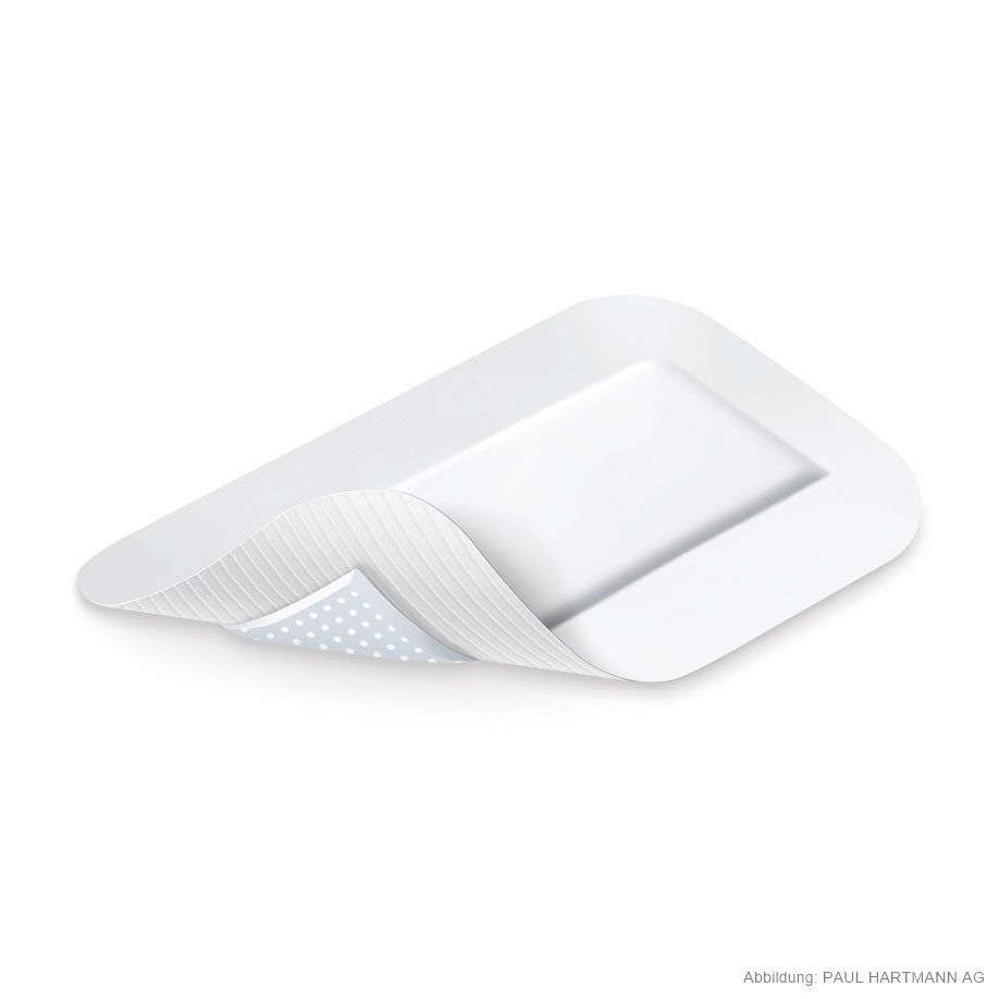 Selbstklebender Wundverband aus weichem Trägervlies und zentralem Wundkissen 6,5 x 2,5 cm mit DryBarrier® Technologie, einzeln eingesiegelt, die Wundkontaktschicht aus einem feinmaschigen Polyethylen-Netz verhindert ein Verkleben mit der Wunde, eine Transferschicht leitet das Exsudat in die Absorptionsschicht und wird dort dauerhaft gespeichert, um Rücknässung zu vermeiden, sehr gute Saugkapazität und hoch speicherfähig, mit zusätzlichem Polstereffekt, hautfreundlich durch hypoallergenen, synthetischen Kleber.