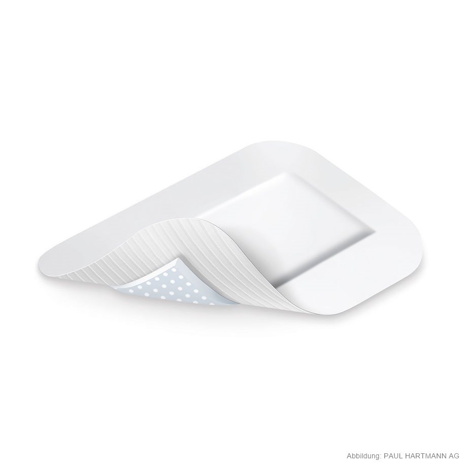 Selbstklebender Wundverband aus weichem Trägervlies und zentralem Wundkissen 4 x 2,5 cm mit DryBarrier® Technologie, einzeln eingesiegelt, die Wundkontaktschicht aus einem feinmaschigen Polyethylen-Netz verhindert ein Verkleben mit der Wunde, eine Transferschicht leitet das Exsudat in die Absorptionsschicht und wird dort dauerhaft gespeichert, um Rücknässung zu vermeiden, sehr gute Saugkapazität und hoch speicherfähig, mit zusätzlichem Polstereffekt, hautfreundlich durch hypoallergenen, synthetischen Kleber.