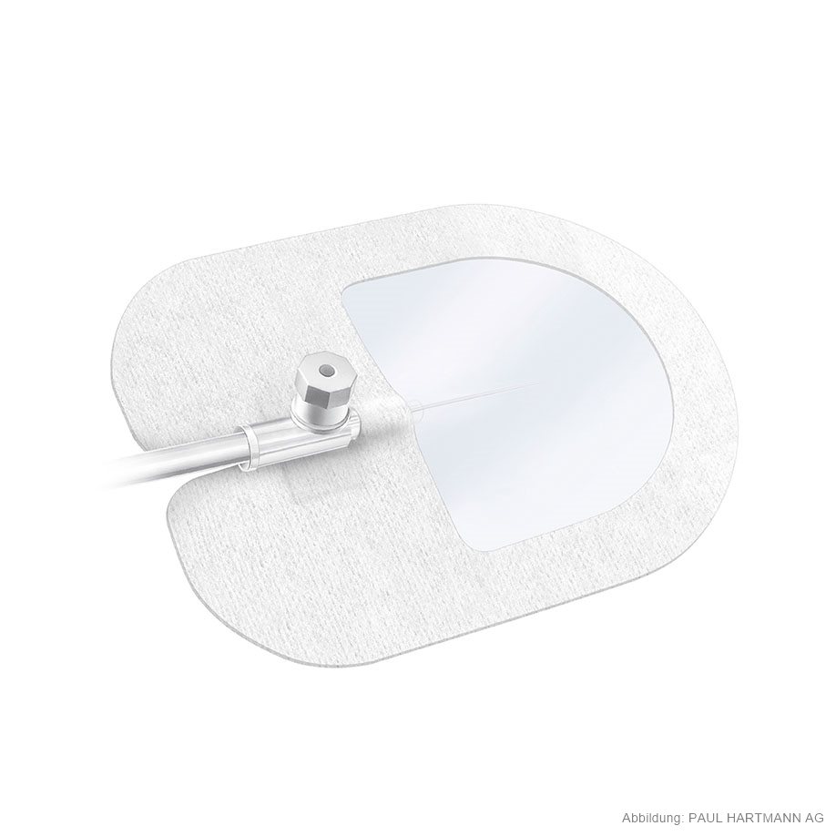 Der selbsthaftende Kanülenfixierverband mit transparentem, großzügigem Sichtfenster aus keim- und wasserdichter, semipermeabler Polyurethan-Folie und stabilisierendem Vliesrahmen bietet eine besonders sichere Fixierung durch starke Klebekraft und hohe Stabilität der Vliesverstärkung. Der Verband ist mit einem hautfreundlichem Kleber ausgestattet.