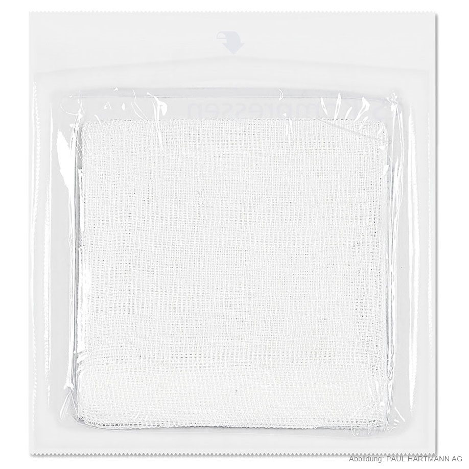 aus Verbandmull EN 14079, 17-fädig, mit eingeschlagenen Schnittkanten (=ES), auch mehrfach aufgeklappt in größeren Formaten verwendbar, ohne dass störende Randfäden auftreten, gute Saugfähigkeit, luftdurchlässig, weich und geschmeidigin Faltschachtel, eingesiegelt zu 5 Stück
