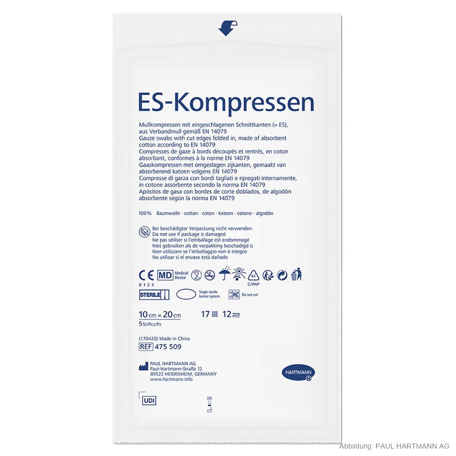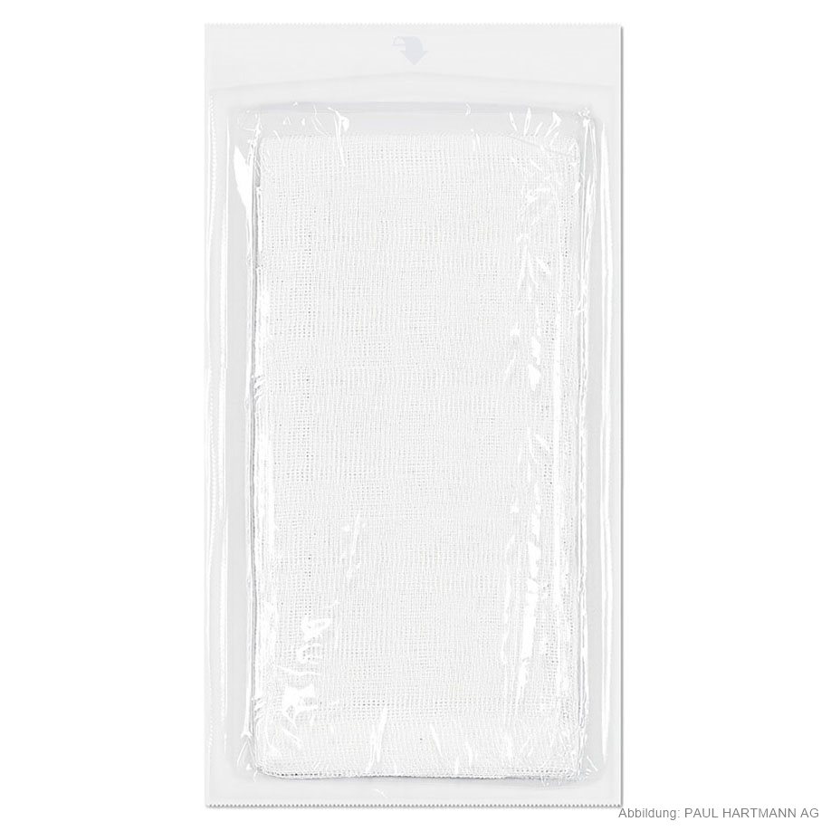 aus Verbandmull EN 14079, 17-fädig, mit eingeschlagenen Schnittkanten (=ES), auch mehrfach aufgeklappt in größeren Formaten verwendbar, ohne dass störende Randfäden auftreten, gute Saugfähigkeit, luftdurchlässig, weich und geschmeidig, in Faltschachtel, eingesiegelt zu 5 Stück