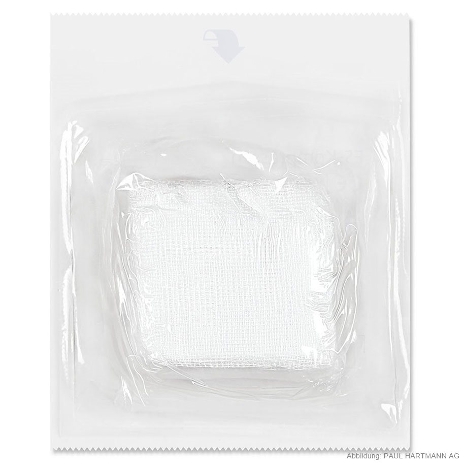 aus Verbandmull EN 14079, 17-fädig, mit eingeschlagenen Schnittkanten (=ES), auch mehrfach aufgeklappt in größeren Formaten verwendbar, ohne dass störende Randfäden auftreten, gute Saugfähigkeit, luftdurchlässig, weich und geschmeidig, in Faltschachtel, eingesiegelt zu 10 Stück