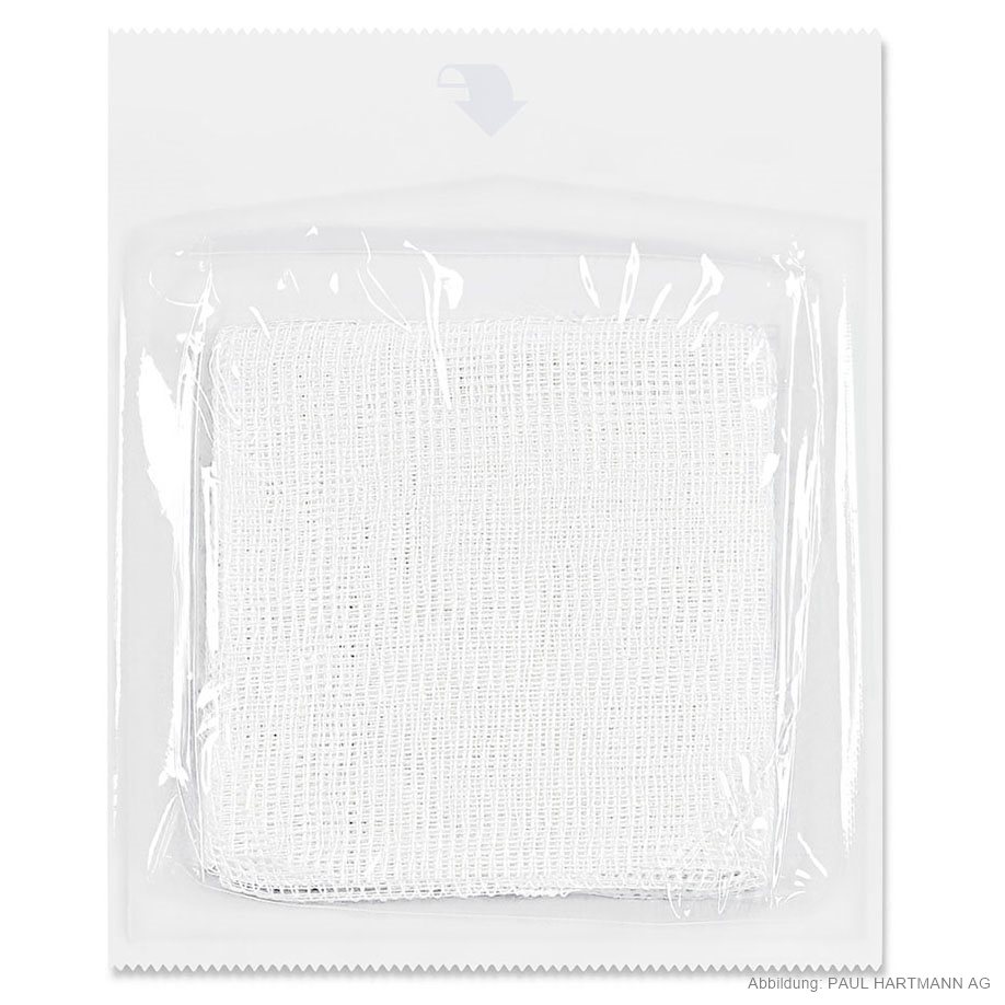aus Verbandmull EN 14079, 17-fädig, mit eingeschlagenen Schnittkanten (=ES), auch mehrfach aufgeklappt in größeren Formaten verwendbar, ohne dass störende Randfäden auftreten, gute Saugfähigkeit, luftdurchlässig, weich und geschmeidig, in Faltschachtel, eingesiegelt zu 5 Stück