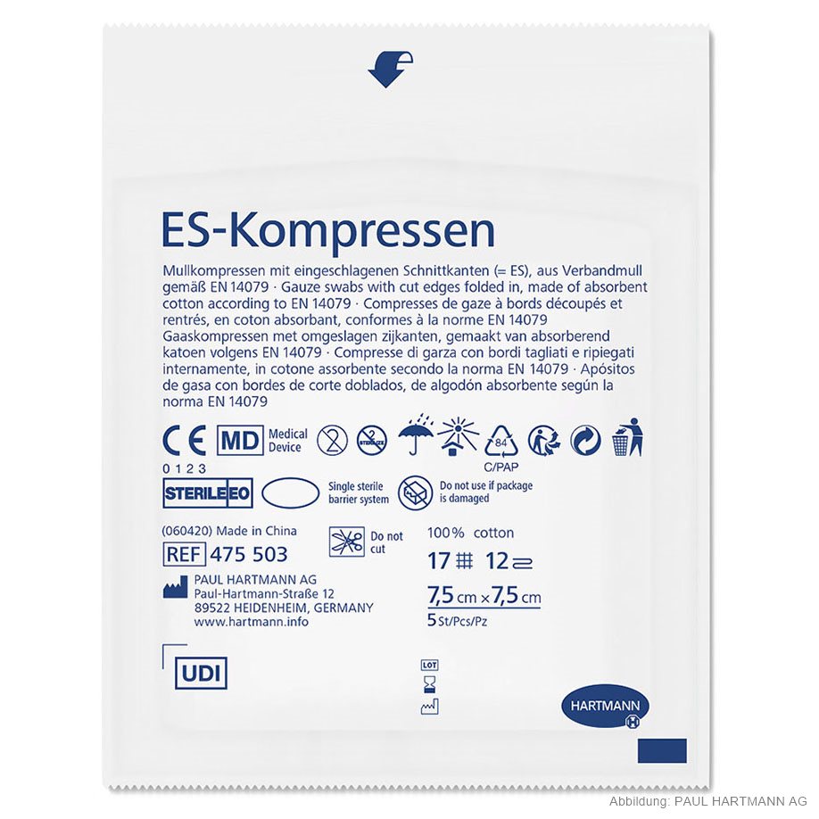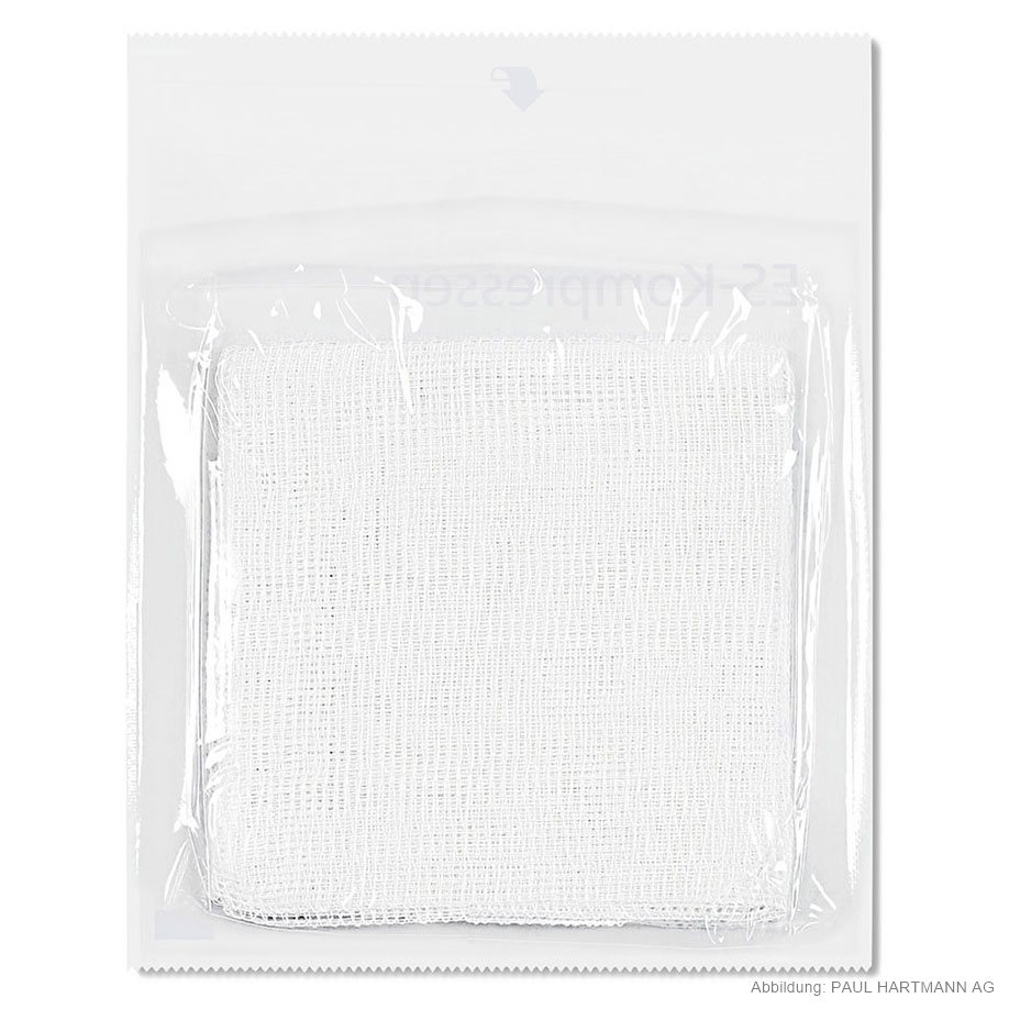 aus Verbandmull EN 14079, 17-fädig, mit eingeschlagenen Schnittkanten (=ES), auch mehrfach aufgeklappt in größeren Formaten verwendbar, ohne dass störende Randfäden auftreten, gute Saugfähigkeit, luftdurchlässig, weich und geschmeidig in Faltschachtel, eingesiegelt zu 5 Stück