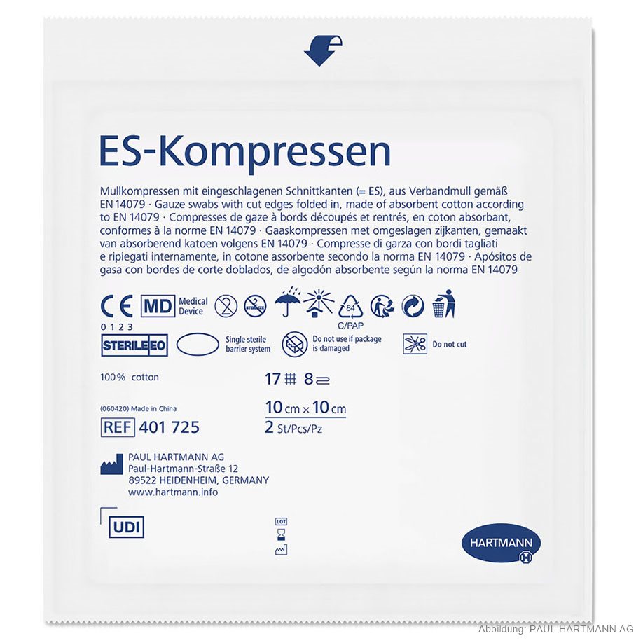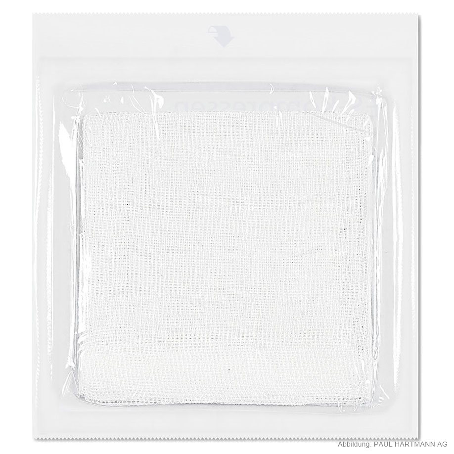 aus Verbandmull EN 14079, 17-fädig, mit eingeschlagenen Schnittkanten (=ES), auch mehrfach aufgeklappt in größeren Formaten verwendbar, ohne dass störende Randfäden auftreten, gute Saugfähigkeit, luftdurchlässig, weich und geschmeidig in Faltschachtel, eingesiegelt zu 2 Stück