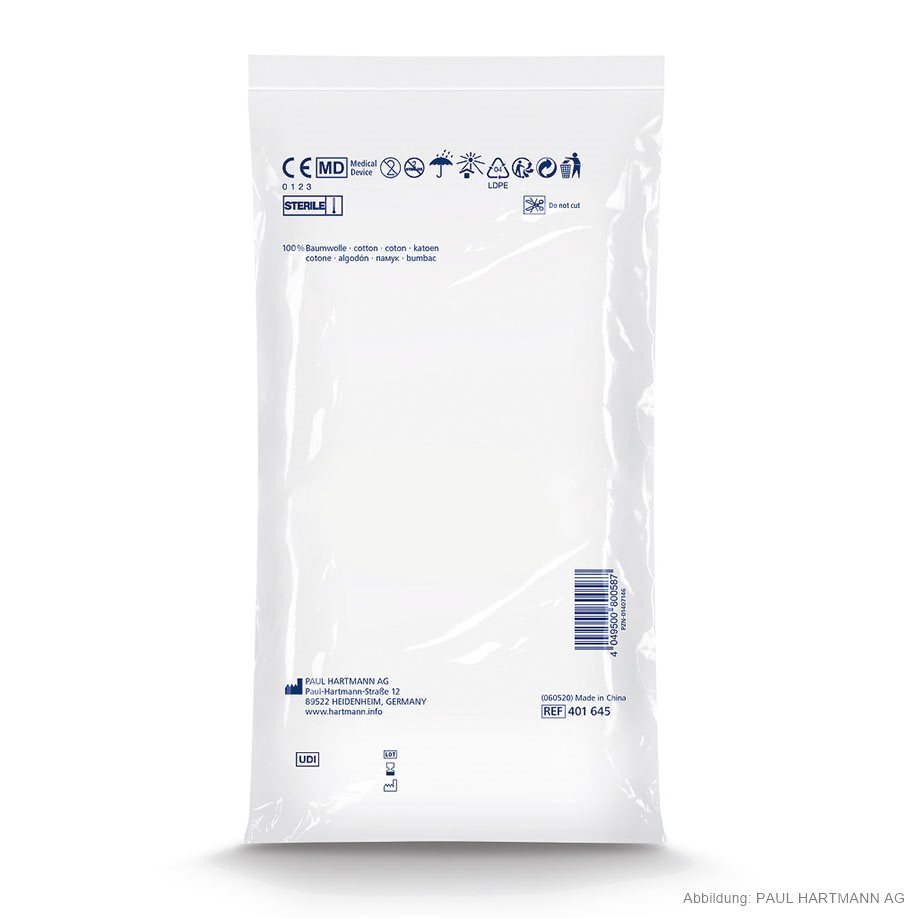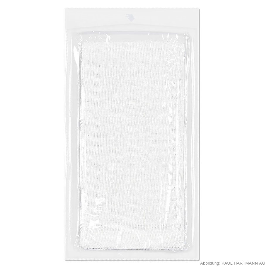 aus Verbandmull EN 14079, 17-fädig, mit eingeschlagenen Schnittkanten (=ES), auch mehrfach aufgeklappt in größeren Formaten verwendbar, ohne dass störende Randfäden auftreten, gute Saugfähigkeit, luftdurchlässig, weich und geschmeidig in Folienbeutel, eingesiegelt zu 2 Stück