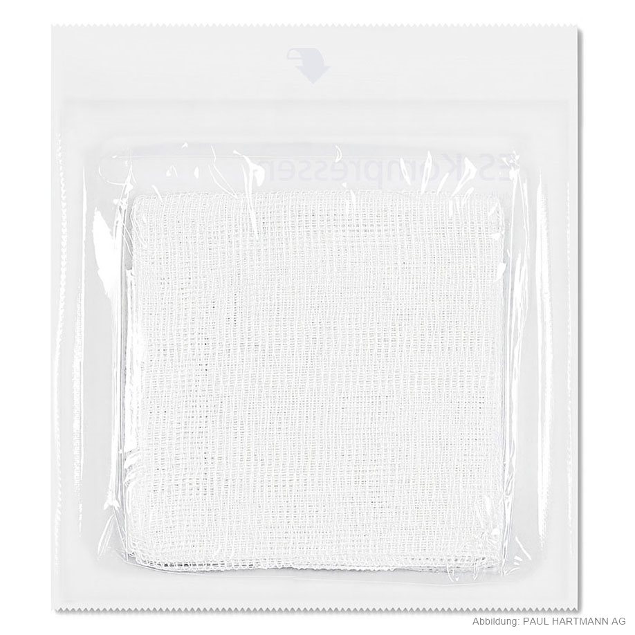 aus Verbandmull EN 14079, 17-fädig, mit eingeschlagenen Schnittkanten (=ES), auch mehrfach aufgeklappt in größeren Formaten verwendbar, ohne dass störende Randfäden auftreten, gute Saugfähigkeit, luftdurchlässig, weich und geschmeidig in Faltschachtel, eingesiegelt zu 2 Stück