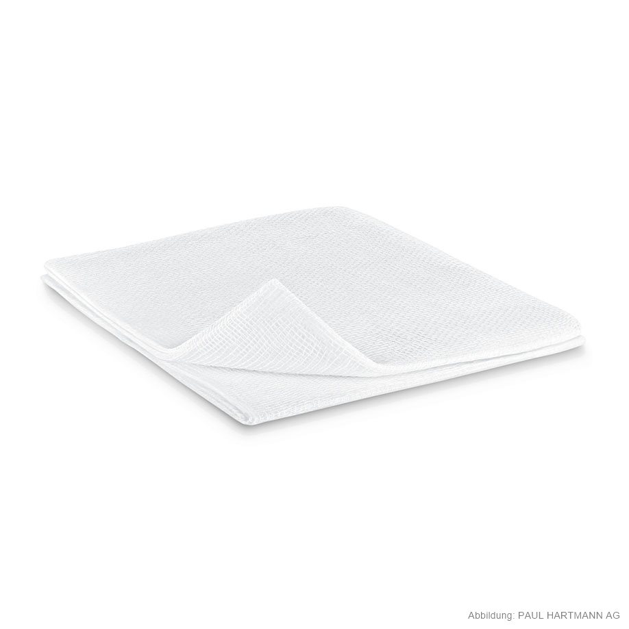 aus Verbandmull EN 14079, 17-fädig, mit eingeschlagenen Schnittkanten (=ES), auch mehrfach aufgeklappt in größeren Formaten verwendbar, ohne dass störende Randfäden auftreten, gute Saugfähigkeit, luftdurchlässig, weich und geschmeidig, in sterilisierbarem Papierbeutel