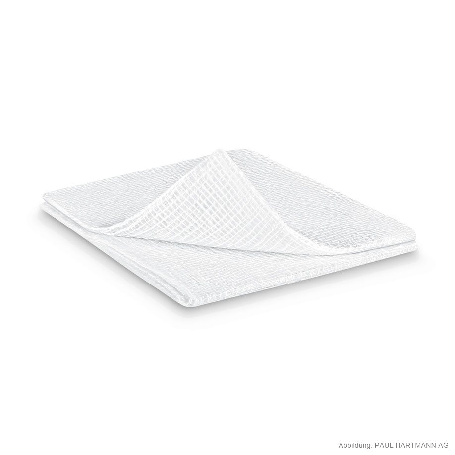 aus Verbandmull EN 14079, 17-fädig, mit eingeschlagenen Schnittkanten (=ES), auch mehrfach aufgeklappt in größeren Formaten verwendbar, ohne dass störende Randfäden auftreten, gute Saugfähigkeit, luftdurchlässig, weich und geschmeidig, in sterilisierbarem Papierbeutel