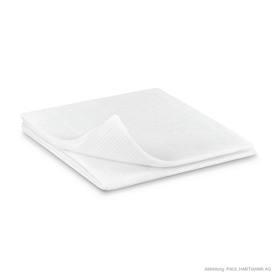aus Verbandmull EN 14079, 17-fädig, mit eingeschlagenen Schnittkanten (=ES), auch mehrfach aufgeklappt in größeren Formaten verwendbar, ohne dass störende Randfäden auftreten, gute Saugfähigkeit, luftdurchlässig, weich und geschmeidig, in sterilisierbarem Papierbeutel