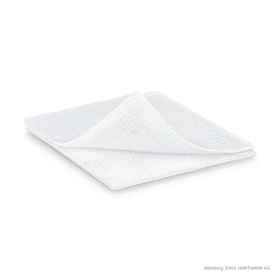 aus Verbandmull EN 14079, 17-fädig, mit eingeschlagenen Schnittkanten (=ES), auch mehrfach aufgeklappt in größeren Formaten verwendbar, ohne dass störende Randfäden auftreten, gute Saugfähigkeit, luftdurchlässig, weich und geschmeidig in sterilisierbarem Papierbeutel