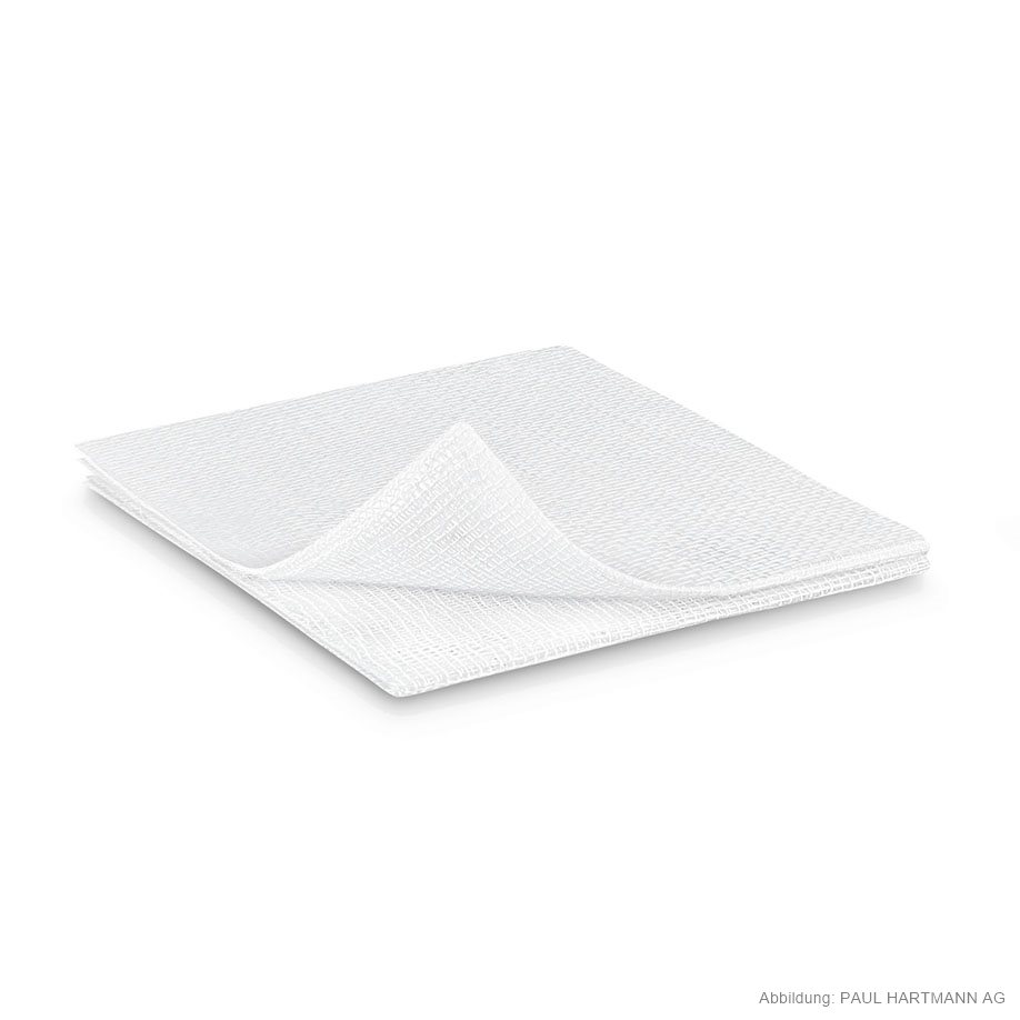 aus Verbandmull EN 14079, 17-fädig, mit eingeschlagenen Schnittkanten (=ES), auch mehrfach aufgeklappt in größeren Formaten verwendbar, ohne dass störende Randfäden auftreten, gute Saugfähigkeit, luftdurchlässig, weich und geschmeidig, in sterilisierbarem Papierbeutel