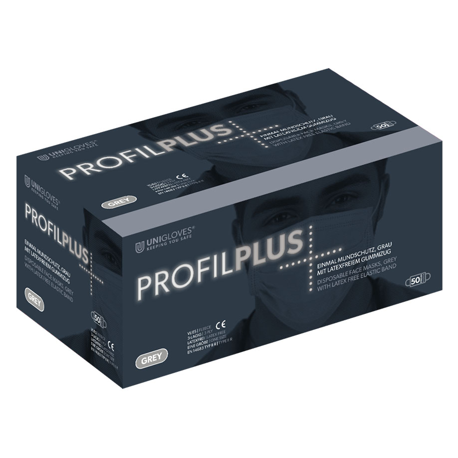 Einmal-Mundschutz Profil Plus, mit Gummizug, grau (50 Stck.) UK = 10 Pack