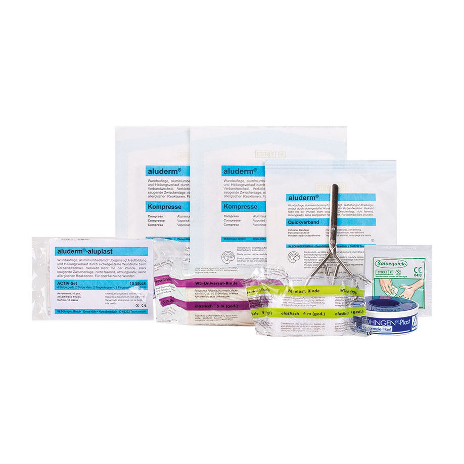 Bei jeder Tour dabei: durch die verstellbaren Klettbänder kann die Tasche einfach an Lenker, Gepäckträger oder Verstrebungsstangen befestigt werden. Inhalt: aluderm® Kompressen, aluderm® Quickverband, aluderm®-aluplast Wundpflaster, SÖHNGEN®-Plast Heftpflaster, WS-elast. Binde, WS-Idealbinde, Schere, Wunddesinfektion. Reißverschlusstasche, ca. 135 x 100 x 50 mm, Nylongewebe, orange.