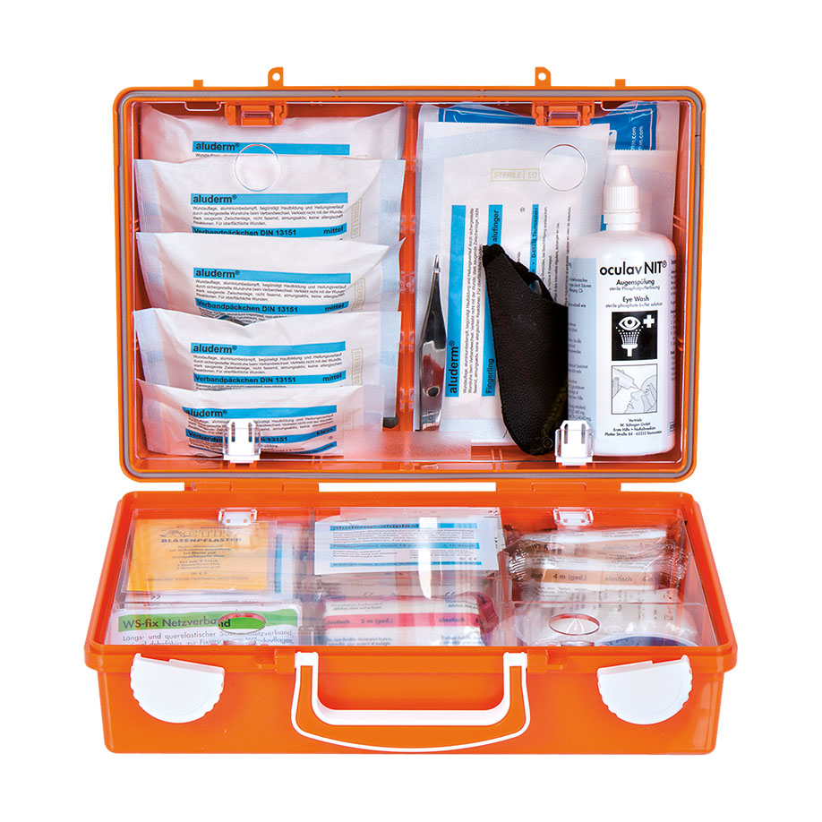 Die Koffer der Serie Erste Hilfe DIREKT sind Erste-Hilfe-Koffer für kleinere Betriebe und Gruppen aus Verwaltung, Handwerk und Dienstleistung. Immer mit Norm-Inhalt nach DIN 13157, zuzüglich Erste-Hilfe-Material nach berufsspezifischer Risikobewertung. Hier stimmt einfach alles. Erste-Hilfe-Material nur vom Feinsten - damit es Ihnen und Ihren Mitarbeitern schnell wieder gut geht. aluderm® und aluderm®-aluplast mit aluminiumbedampfter Wundauflage sind nur einige Beispiele der hochwertigen Markenverbandstoffe. Erste Hilfe DIREKT - einfach einmalig und praktisch. Ca. 310 x 210 x 130 mm, ABS-Kunststoff, orange, inkl. Wandhalterung mit 90°-Stopp-Arretierung. Transparente Abdeckplatten, Gummidichtung, Inneneinteilung verstellbar, Drehverschlüsse, Plombiervorrichtung, Sicherheitsplombe.