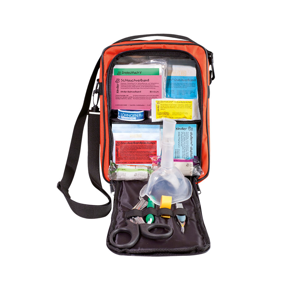 Für die schnelle Erste-Hilfe-Versorgung bei allen Aktivitäten außerhalb des Kindergartens. Leicht und bequem mitzuführen. Mit Spezialfüllung KiTa Großer Wandertag. Inkl. Outdoor-Erweiterung wie z. B. Zeckenpinzette, Signalpfeife, Kältekompresse u. a. m. Praktische Umhängetasche, ca. 310 x 225 x 70 mm, wasserabweisendes Nylongewebe, orange, schwarz abgesetzt. Steckschlaufen für Instrumente in der Deckellasche, Bodenteil mit Unterteilungssteg.