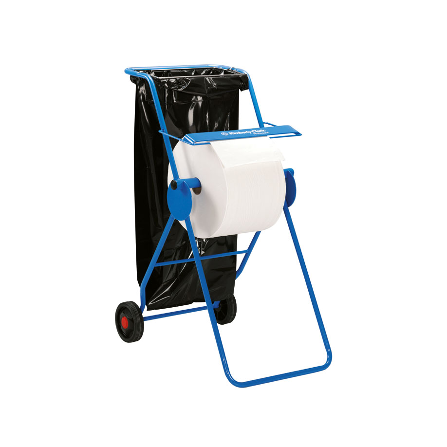 mobiler Spender aus Stahlrohr zur schnellen, unkomplizierten Entnahme von Papierwischtüchern als Großrollen, mit Bremspedal, Maße (LxBxH): 109 x 50 x 74 cm, passend für Kimberly Produkte: 38664, 38666, 7623, 7643, 47658, 6036, 6063, 7140, 7153, 7200, 7202, 7210, 7214, 7224, 7238, 7240, 7241, 7247, 7248, 7249, 7300, 7301, 7317, 7331, 7356, 7359, 7425, 7426, 7452, 7454, 7472, 7473, 7474, 7476, 7477, 8356, 8371, 8374, 8377, 8384, 8389 und 12889