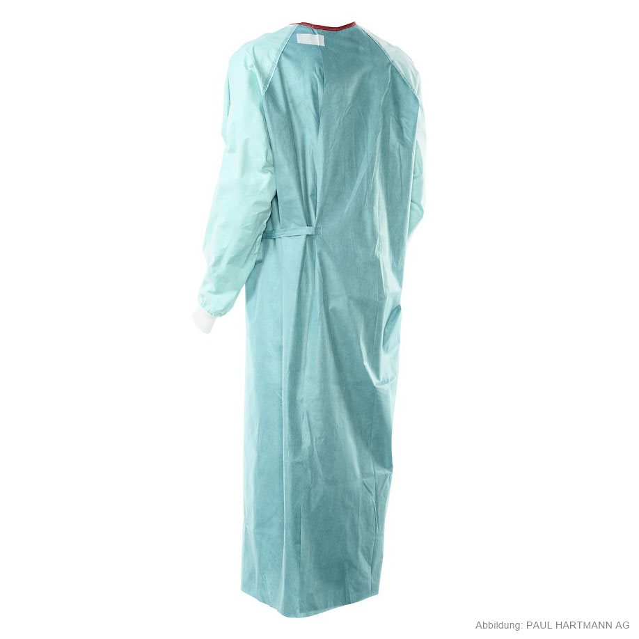 Vollarmverstärkter OP-Wickelmantel mit flüssigkeitsundurchlässigem, atmungsaktivem vollarm verstärktem Raglanarm sowie flüssigkeitsundurchlässiger, atmungsaktiver Brustverstärkungszone und besonders breiter Überlappung der Rückenpartie, mit dem zum Patent angemeldeten Combitape®-Verschlusssystem welches an jeder Stelle der Mantelrückseite sicher haftet und eine flexible Anpassung des Halsausschnittes gewährleistet, mit rotem Halsausschnitt (verstärkt) zur besseren Identifikation im OP, für Operationen mit extrem hohem Flüssigkeitsaufkommen, mit SMS-Einschlag und Papierhandtüchern, einzeln verpackt.