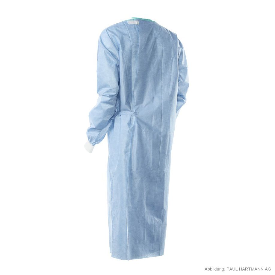 OP-Wickelmantel aus mehrschichtigem, flüssigkeitsabweisendem Vliesstoff, mit hohem Widerstand gegen Durchfeuchtung und Keimdurchwanderung, abriebfest und fusselarm, mit besonders breiter Überlappung der Rückenpartie welcher mit dem Combitape®-Verschlusssystem an jeder Stelle der Mantelrückseite sicher verschließbar ist und eine flexible Anpassung des Halsausschnittes gewährleistet, mit grünem Halsausschnitt (unverstärkt) zur besseren Identifikation im OP, mit elastischen, langen Strickbündchen, für Operationen mit geringem bis mittlerem Flüssigkeitsaufkommen, mit SMS-Einschlag und Papierhandtüchern, einzeln verpackt.