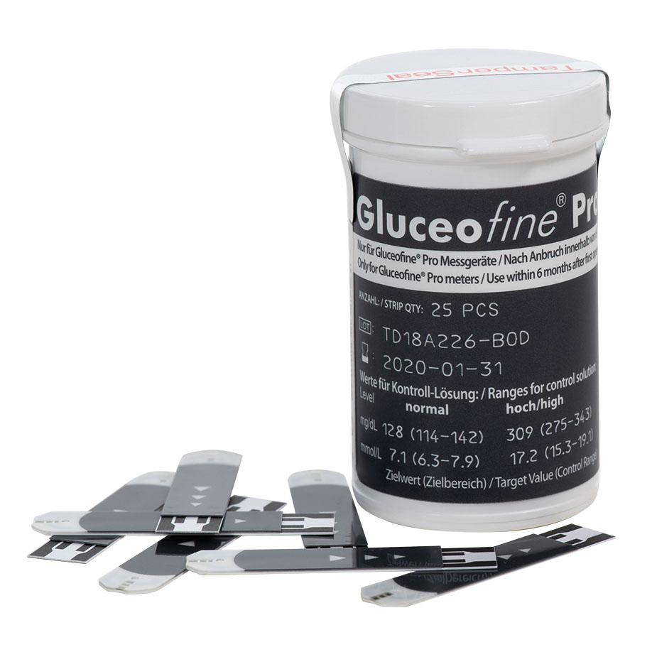 mit innovativer Sensor-Technologie, die Teststreifen sind aufgrund ihrer Größe und Stabilität leicht zu handhaben, vor allem für ältere Personen, nur zur Verwendung mit Gluceofine® Pro Messgeräten