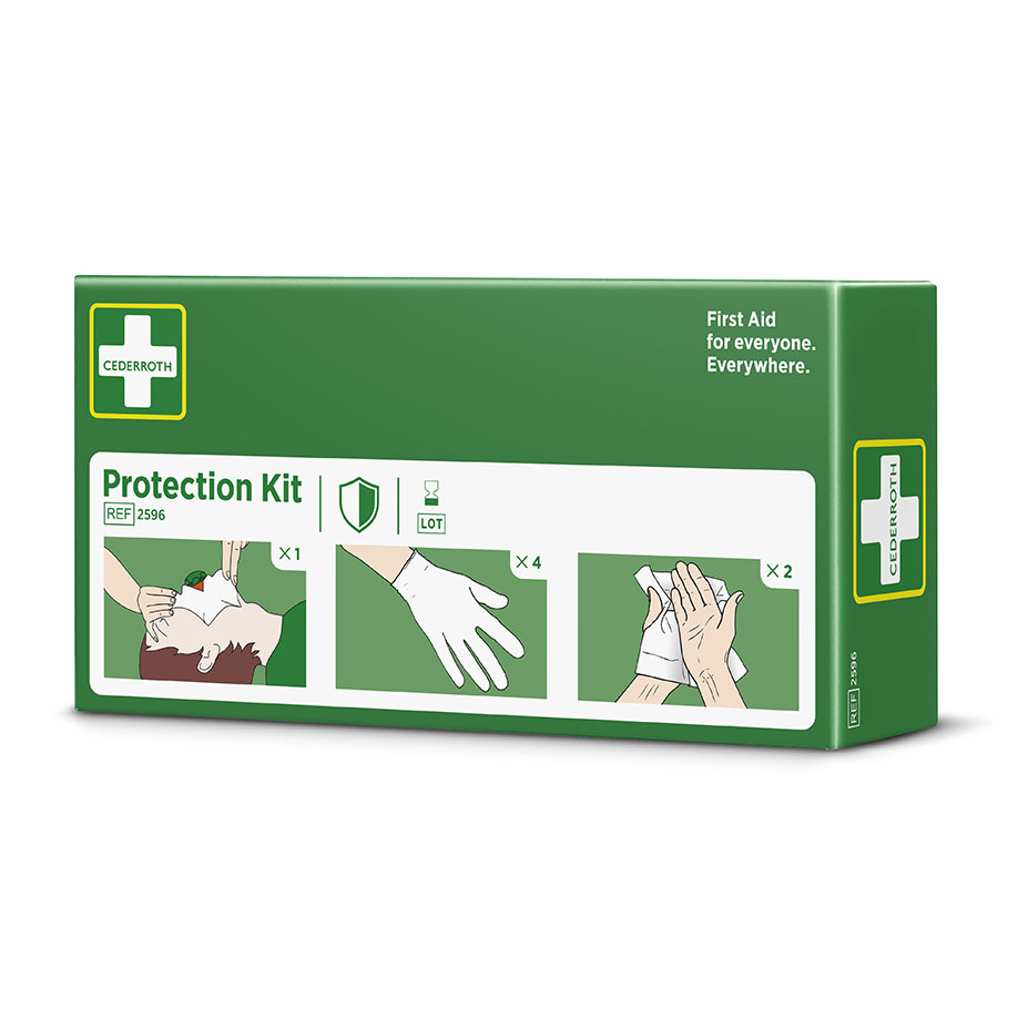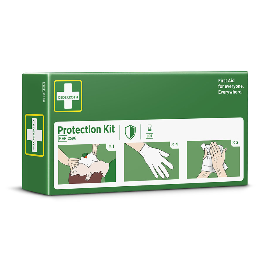 Das Cederroth Schutzpaket ist ein Helfer-Schutz-Kit mit Beatmungsmaske mit Rückschlagventil, 4 x Handschuhe und 2 x Cederroth Safety Hand Cleanser Tücher (70% Alkohol). Die Beatmungsmaske ist ein Hilfsmittel für die korrekte Mund-zu-Mund-Beatmung. Gleichzeitig verringert sie das Risiko bei Kontakt von Helfer und Verletzten.
