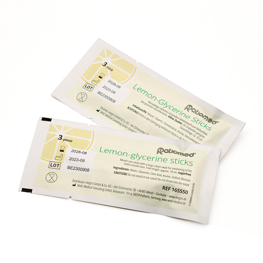 Mundpflege-Stäbchen für die orale Hygiene, mit großem Wattebausch zum mühelosen Reinigen und Befeuchten des gesamten Mundbereichs. Getränkt mit einer Lösung aus Wasser, Glyzerin, Citronensäure, Aroma, Natriumbenzoat, ohne Zucker, für Diabetiker geeignet, Gesamtlänge: ca. 10 cm. Nicht in den Gehörgang einführen! Nicht in die Toilette werfen!