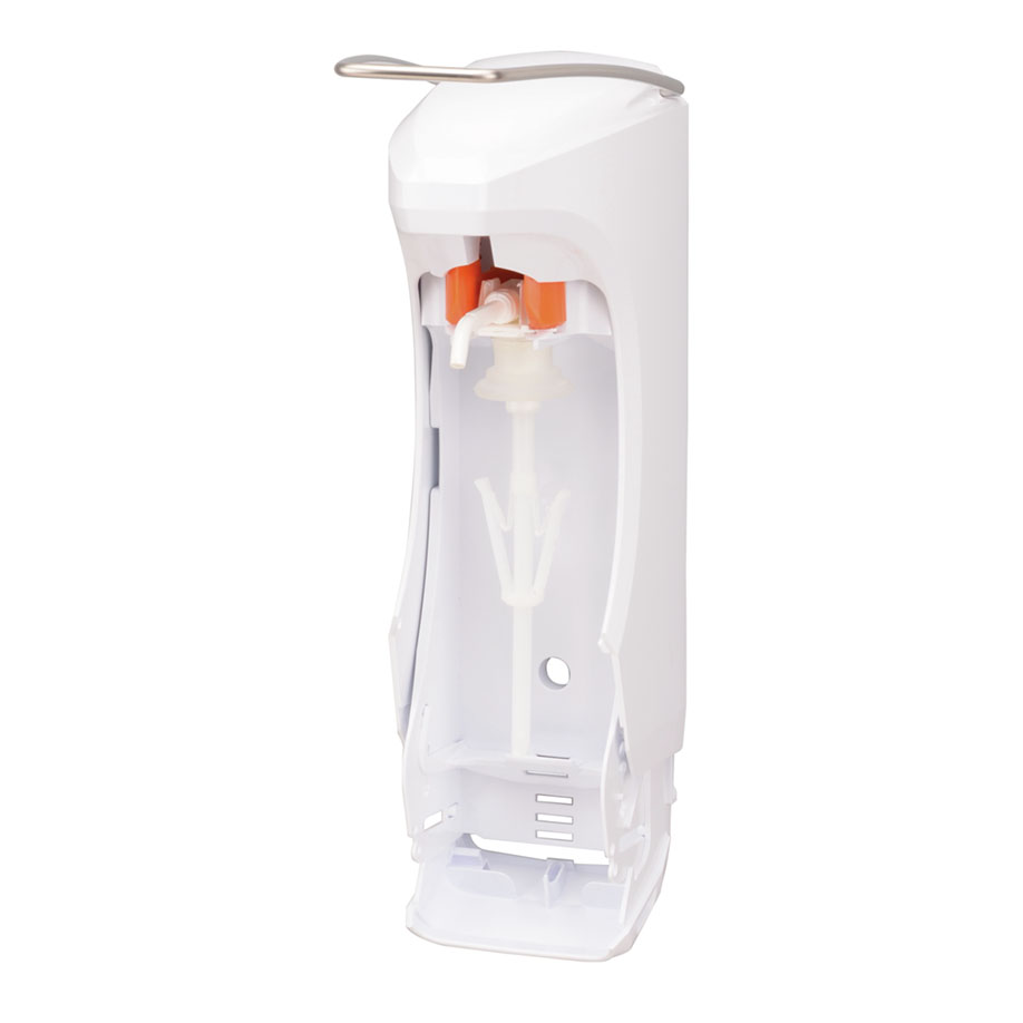 RX 5 M manueller Spender für Desinfektionsmittel, Alcogel, Seifen und fließfähige Lotionen, für Wandmontage, geeignet für 500 ml Euroflaschen (nicht enthalten), Kunststoff-Gehäuse weiß, Edelstahl-Bedienhebel, mit DHP-Einwegpumpe, Dosiermenge 1,5 ml/Hub, Spender nicht abschließbar, mit weißer Abtropfschale
