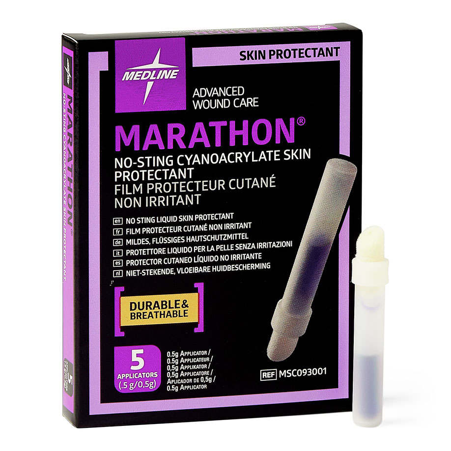 Marathon® ist eine Flüssigkeitsbarriere mit einer Formel auf 100 % Cyanacrylat-Basis, die die Haut vor den negativen Auswirkungen von Feuchtigkeit, Scherkräften und Reibung schützen soll und auf der Haut nicht brennt.
