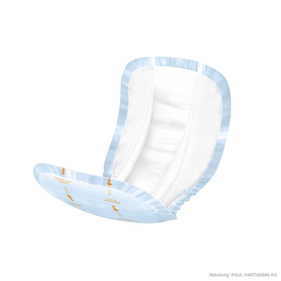 Moderne Komplett-Inkontinenzeinlage mit einem dreischichtigen, anatomisch geformten Saugkern, schnell trocknender Verteilungsschicht sowie weichem, geschwungenem Auslaufschutz, elastischen Fäden im Schrittbereich, Folienrückseite und Nässeindikator. Dank seines speziellen Saugkerns sorgt MoliCare® Form für einen maximalen Auslaufschutz durch hohe Saug- und Aufnahmefähigkeit. Die hohe Aufnahmefähigkeit von MoliCare® Form schützt die Haut und sorgt für einen hohen Tragekomfort. 62 x 29,5 cm.
