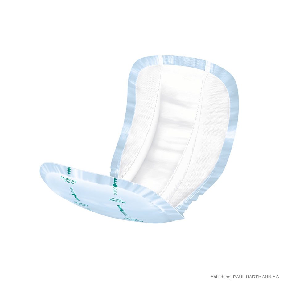 Moderne Komplett-Inkontinenzeinlage mit einem dreischichtigen, anatomisch geformten Saugkern, schnell trocknender Verteilungsschicht sowie weichem, geschwungenem Auslaufschutz, elastischen Fäden im Schrittbereich, Folienrückseite und Nässeindikator. Dank seines speziellen Saugkerns sorgt MoliCare® Form für einen maximalen Auslaufschutz durch hohe Saug- und Aufnahmefähigkeit. Die hohe Aufnahmefähigkeit von MoliCare® Form schützt die Haut und sorgt für einen hohen Tragekomfort. 62 x 29,5 cm.