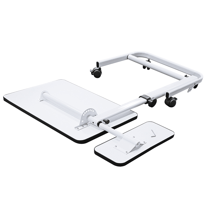 Der Multifunktionsbeistelltisch besteht aus einer kunststoffbeschichteten Ablageplatte mit schwarzer Schutzumrandung, ebenfalls aus Kunststoff, und einem lackierten robusten Stahlrahmen mit 4 leichtgängigen Doppellenkrollen, 2 davon sind feststellbar. Stufenlose Höhenverstellung von 61 - 94 cm, die Neigung der Tischplatte ist durch variable Arretierungen 8-fach verstellbar bis zu einem Winkel von 45°, Schrägstellen der Standsäule per Arretierungsbolzen (90° oder 80° Neigung bzw. Arretierung des Fußteils in zusammengeklappter Position), Größe der Ablagefläche: 40 x 60 cm, Tragfähigkeit: ca. 10 kg bei senkrecht gestellter Säule, Maße zusammengeklappt: 92 x 61 x 11 cm, Farbe von Ablageplatte und Gestell: weiß, mit einer zusätzlichen feststehenden, seitlichen, waagerechten Ablagefläche 18 x 40 cm