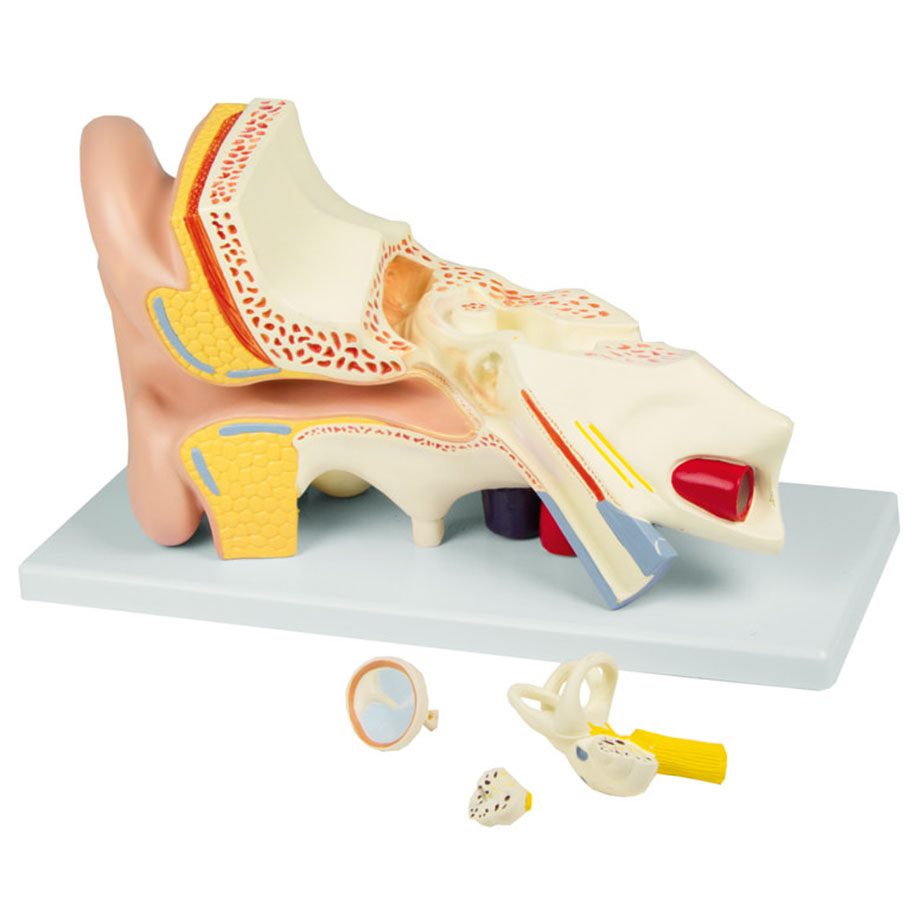 Dieses Modell stellt in dreifacher Lebensgröße das äußere Ohr, das Mittel- und das Innenohr dar. Das Trommelfell mit Malleus, Incus und Stapes kann herausgenommen werden. Cochlea, Labyrinth, Nervus vestibularis und cochlearis sind herausnehmbar, eine Cochleahälfte kann abgenommen werden. Auf Grundplatte. Größe: 36 x 16 x 20 cm, Gewicht: ca. 1 kg.