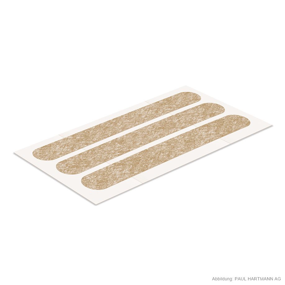 Hypoallergene Wundnahtstreifen aus hautfarbenem Vliesstoff mit Polyacrylat-Kleber, mit abgerundeten Ecken, extrem luft- und wasserdampfdurchlässig, keine Mazeration, sicher haftend, schmerzlos und ohne Rückstände zu entfernen, strahlenindifferent, temperatur- und alterungsbeständig, eingesiegelt zu 6 Stück.