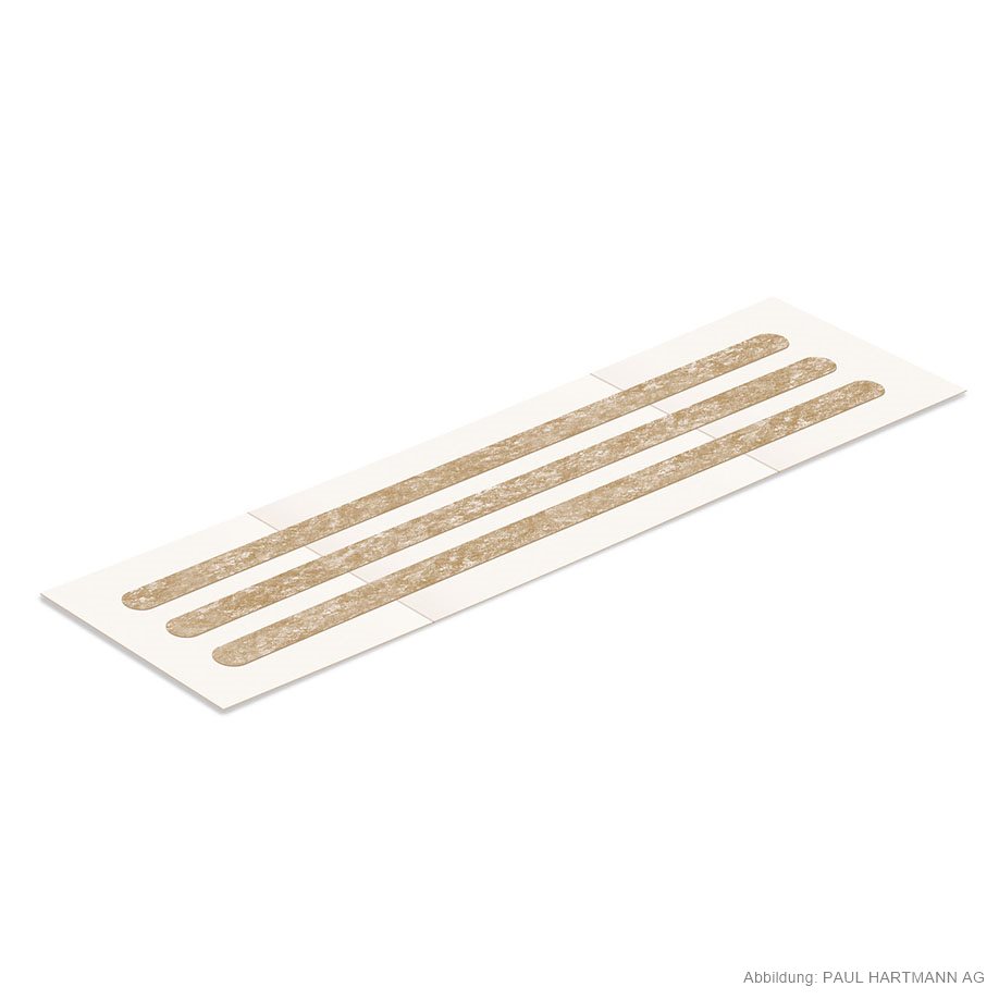 Hypoallergene Wundnahtstreifen aus hautfarbenem Vliesstoff mit Polyacrylat-Kleber, mit abgerundeten Ecken, extrem luft- und wasserdampfdurchlässig, keine Mazeration, sicher haftend, schmerzlos und ohne Rückstände zu entfernen, strahlenindifferent, temperatur- und alterungsbeständig, eingesiegelt zu 5 Stück.