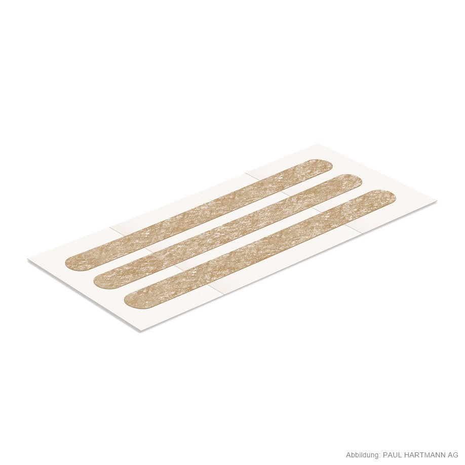 Hypoallergene Wundnahtstreifen aus hautfarbenem Vliesstoff mit Polyacrylat-Kleber, mit abgerundeten Ecken, extrem luft- und wasserdampfdurchlässig, keine Mazeration, sicher haftend, schmerzlos und ohne Rückstände zu entfernen, strahlenindifferent, temperatur- und alterungsbeständig, eingesiegelt zu 3 Stück