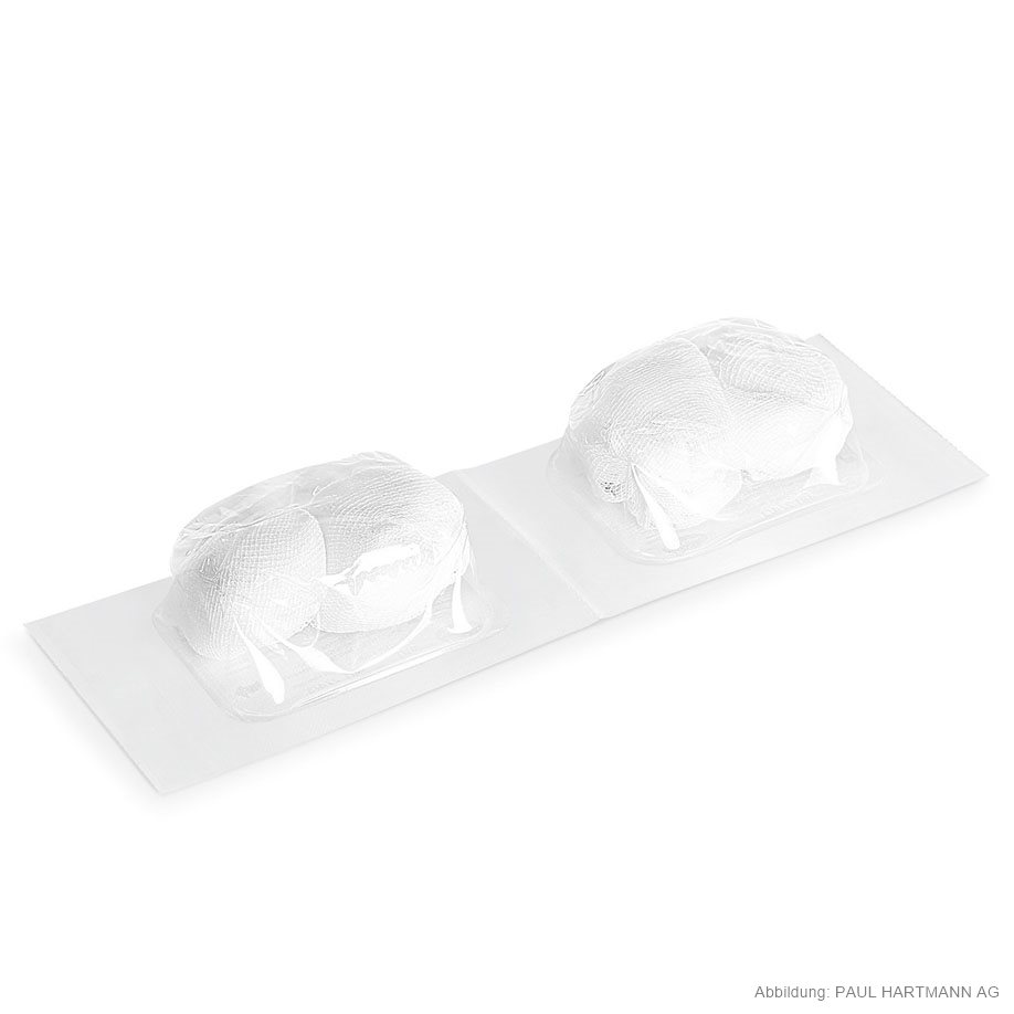 Schlinggaze-Tupfer aus Verbandmull EN 14079, 20fädig, der aus nur einem Mullstück gefertigte Tupfer ist so verschlungen, dass die Schnittkanten sicher im Inneren liegen, mit hohem Absorptionsvermögen.