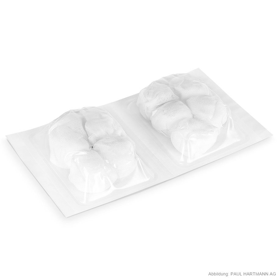Schlinggaze-Tupfer aus Verbandmull EN 14079, 20fädig, der aus nur einem Mullstück gefertigte Tupfer ist so verschlungen, dass die Schnittkanten sicher im Inneren liegen, mit hohem Absorptionsvermögen.