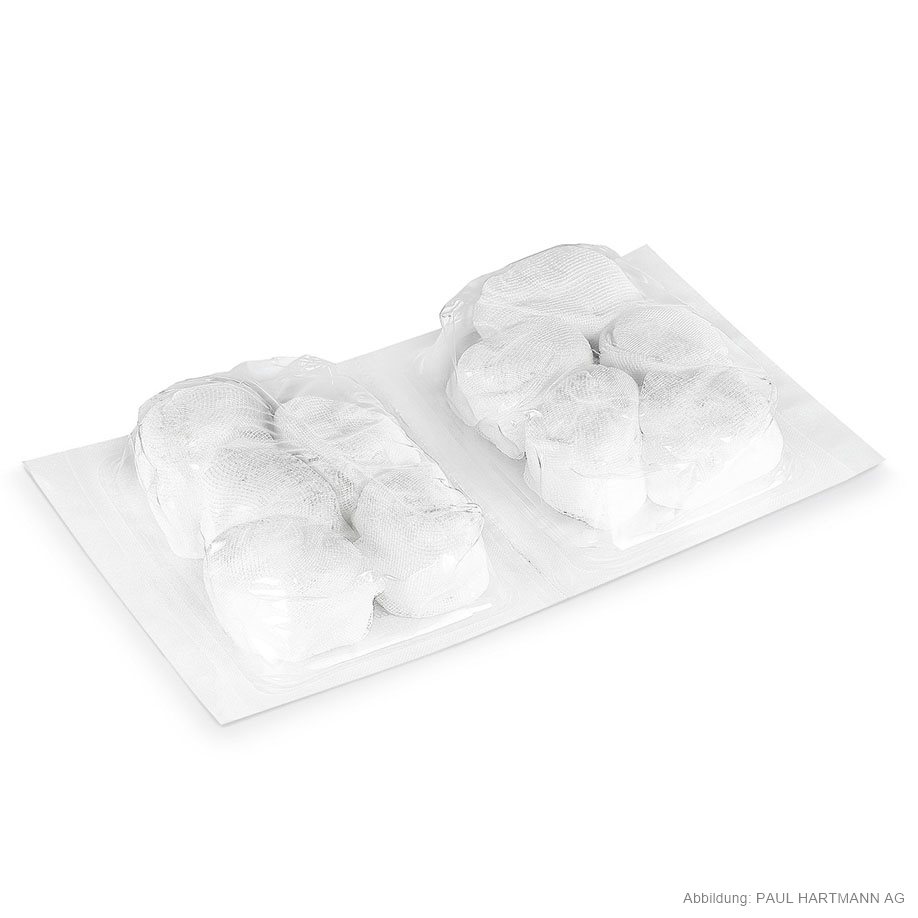 Schlinggaze-Tupfer aus Verbandmull EN 14079, 20fädig, der aus nur einem Mullstück gefertigte Tupfer ist so verschlungen, dass die Schnittkanten sicher im Inneren liegen, mit hohem Absorptionsvermögen.