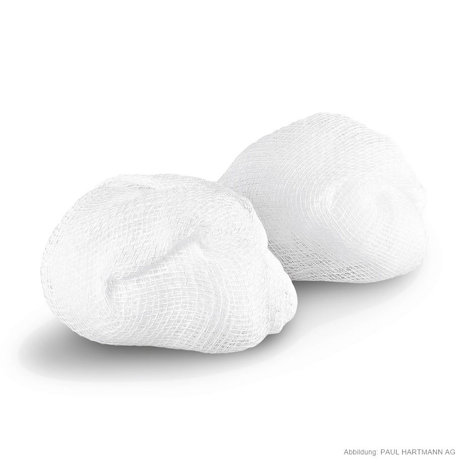 Schlinggaze-Tupfer aus Verbandmull EN 14079, 20fädig, der aus nur einem Mullstück gefertigte Tupfer ist so verschlungen, dass die Schnittkanten sicher im Inneren liegen, mit hohem Absorptionsvermögen.