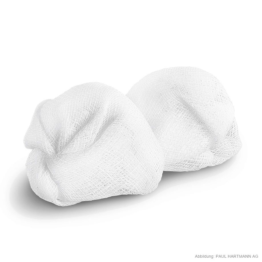 Schlinggaze-Tupfer aus Verbandmull EN 14079, 20fädig, der aus nur einem Mullstück gefertigte Tupfer ist so verschlungen, dass die Schnittkanten sicher im Inneren liegen, mit hohem Absorptionsvermögen.